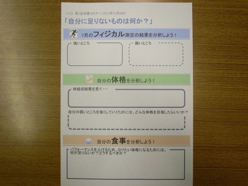 U‐13の選手達は5月に筑波大学で行った、体組成測定の結果を見ながら、真剣にセミナーに参加していました。