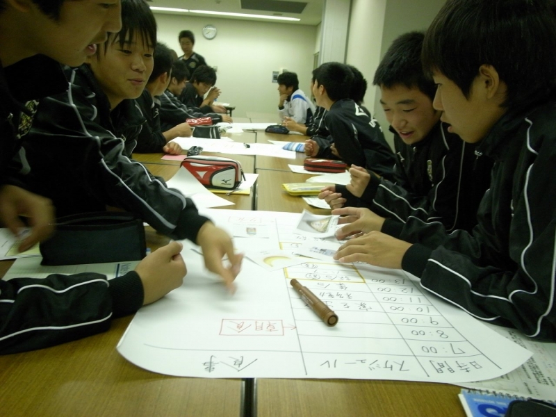 午後に試合がある場合、朝起きてからどのように食事を摂っていくかをグループに分かれて考えました。