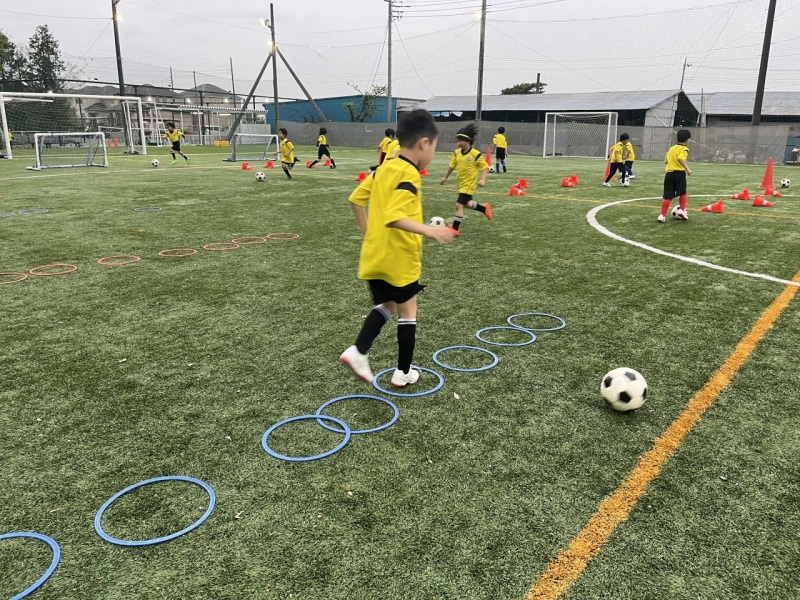ステップやジャンプなどいろいろな動作を繰り返しならがら、スポーツ(サッカー)に必要な身体の使い方などを覚えていきます。