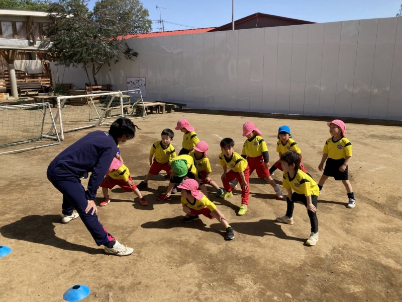 まずは、鬼ごっこなどでじんわり汗をかきながら、怪我予防としてしっかりと準備体操をして始めます。(写真左)