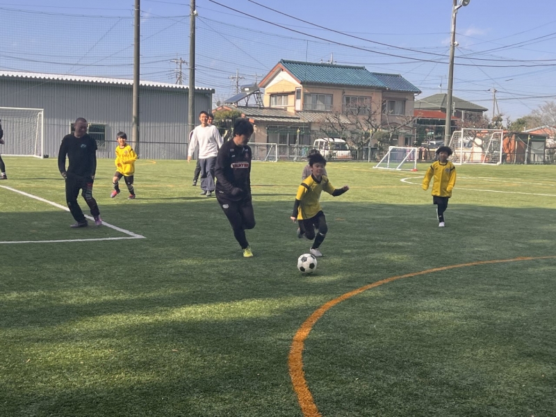 最後は試合を行い、選手達はサッカーを楽しみながらも保護者相手でも身体をぶつけてボールを奪うことや駆け引きをしてドリブルで仕掛けるなど、