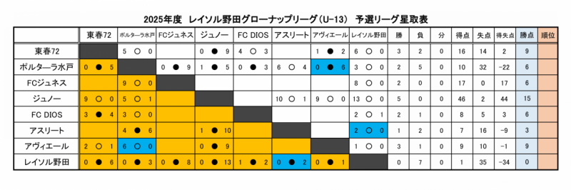 | 9 | 6月22日 | レイソル野田 | 0 - 13 | ジュノー |