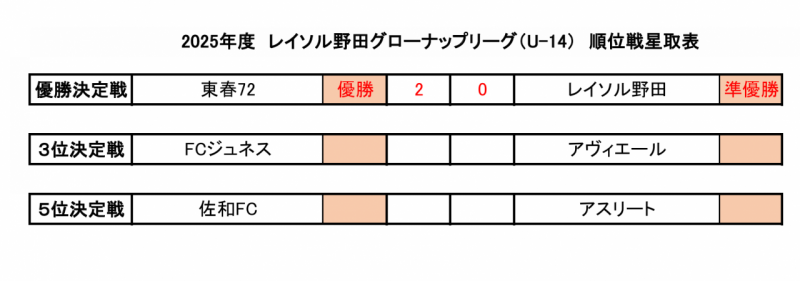 | 5 | 6月21日 | 佐和FC | 0 - 4 | 東春72 |